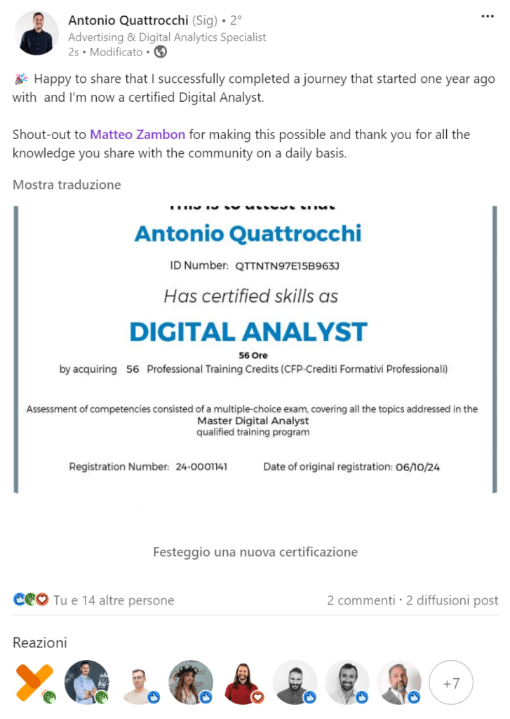 Ogni volta che terminerai un percorso formativo con successo, ti rilasceremo un Attestato ufficiale di completamento da poter condividere con tutto il tuo network professionale su Linkedin o sito web personale.