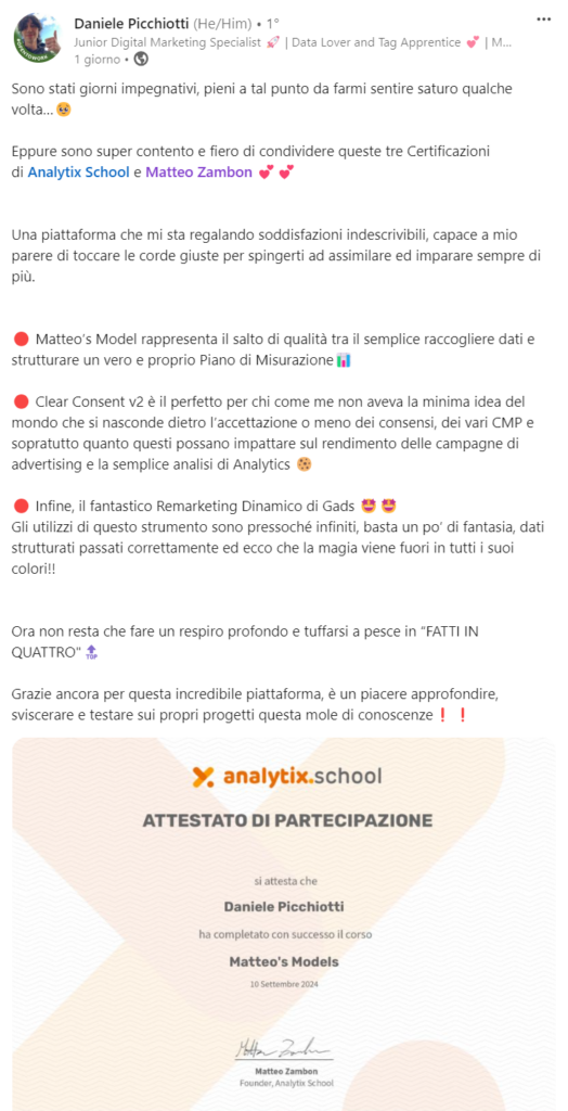 Sono Matteo Zambon, fondatore dell’Analytix School, Beta Tester e primo divulgatore italiano di Google Tag Manager, Alpha Tester di Google Analytics 4 e Co-Fondatore di Tag Manager Italia…